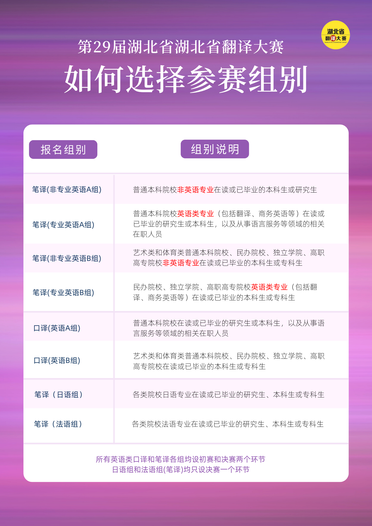 (二)非通用语种组(法语、日语)分别只设“笔译”一个类别。
