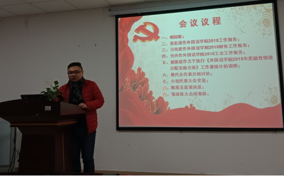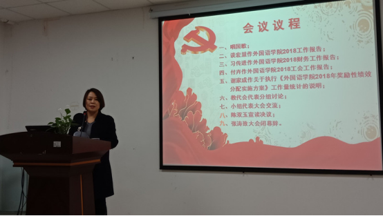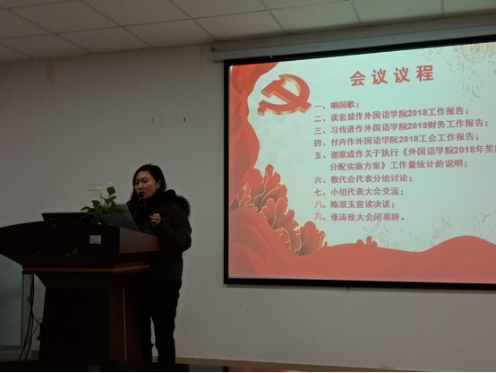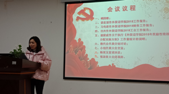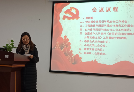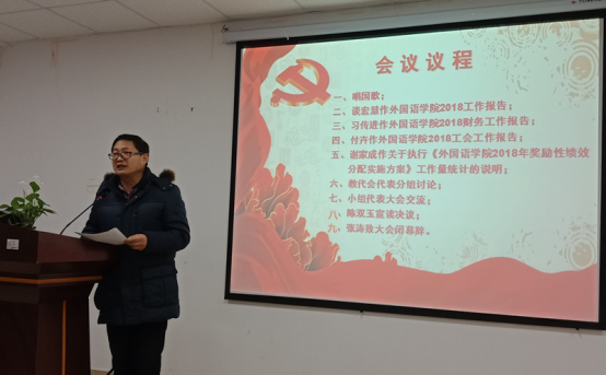 “学者治学、民主建院、凝心聚力促发展”。在教代会分组讨论环节,55名教代会代表分成4组,展开了热烈、充分的讨论,并推选出小组发言人在大会上交流。代表们顾大局、讲责任、讲真话、讲实话,外院当成自己的家,围绕学院事业发展、奖励性绩效分配方案、学院工会财务与福利等,提出了许多好的意见和建议,反映了广大教职工的呼声,为学院科学决策提供了很好的依据,达成了深化外语教育教学改革,以人才兴院、以质量立院、以特色强院、以实力赢得应有的尊重和地位”的思想共识,确立了“教学、科研、管理、服务”有效协同落实“四个回归”,多措并举深化立德树人,以“一带一路”和中国文化“走出去”战略为导向,以学生需求为出发点,调整大学英语课程设置打造“金课”、加快高水平人才引进和教师队伍博士化改造等的学院2019年发展思路。