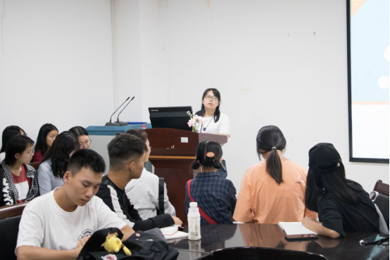 随后,童老师开始宣讲资助政策说明,她主要围绕家庭经济困难学生自助政策体系;学校资助工作体系及工作重点;经济困难认定工作;国奖初评及其他类奖助学金申报这四个方面的内容展开说明。她提出大学生资助政策有三点要求:以优异的成绩获取奖学金;争取资助缓解经济压力;贫困生争取贷款完成学业。