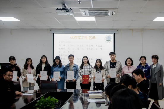 主持人童超介绍了大会的四个流程:教学院长彭泝宣读表彰名单、英语系主任王娟和带队老师蒋娟颁发荣誉证书、学生代表发言、带队老师殷华做实习情况总结。