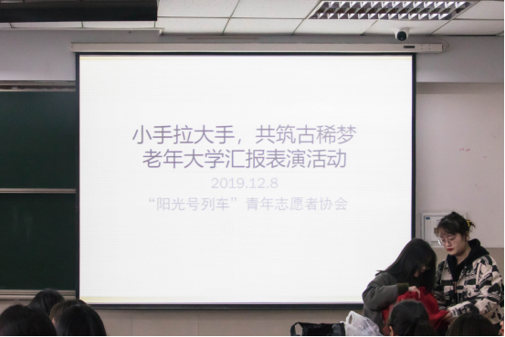 (摄/郑甜 罗娜 文/韩思洁 范期明为弘扬志愿者“奉献、有爱、互助、进步”的精神,同时向老人们传递关爱与温暖,12月8日上午九时三十分,新葡的京官网阳光号列车全体成员在14教南小广场开展了主题为“小手拉大手,共筑古稀梦”的汇报表演活动。志愿者、老人们共同参与。