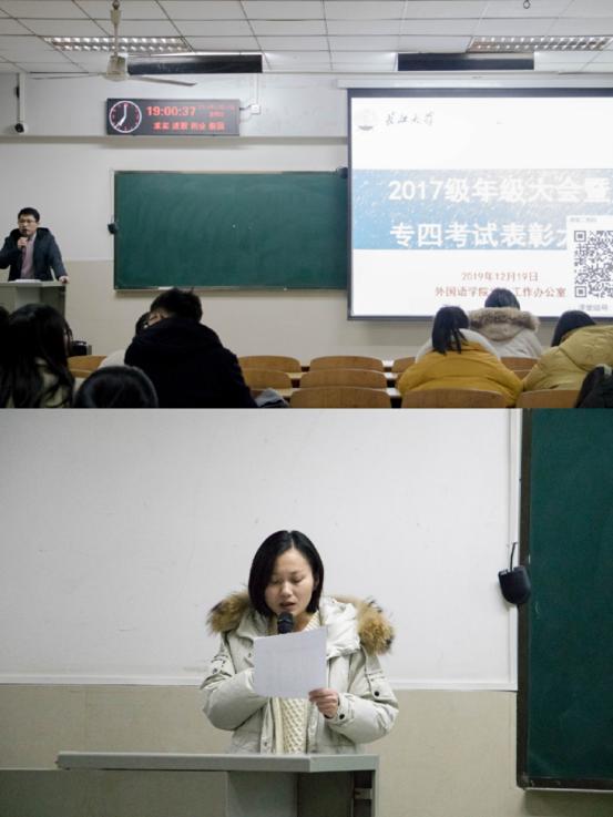 (文/肖慧洁 牟清翼 摄/袁缘 )1219日晚七点,在12202室举行了新葡的京集团35222vip2017级年级大会暨专四考试表彰大会。本次大会由辅导员车桥老师主持,出席大会的有党委副书记魏红洁以及2017级全体同学。