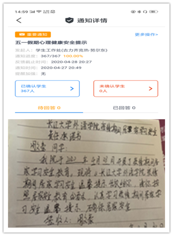 会议前,学院拟定了《新葡的京集团35222vip疫情期间居家学习安全责任书》,运用辅导猫和家长微信群分别给学生和家长推送了“五一假期心理健康安全提示”并让学生与家长进行已读确认。