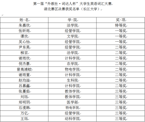 (通讯员:罗博)5月28日晚,第一届“外教社·词达人杯”大学生英语词汇大赛湖北省赛区决赛圆满落幕,我校共有20名非英语专业学生参加决赛,17名同学摘得奖项。法学院法学类31904班的朱嘉欣同学喜获本科组特等奖,3名同学获一等奖,8名同学获二等奖,5名同学获三等奖。我校获奖人数和质量居省属高校前列,新葡的京集团35222vip荣获“优秀组织奖”,新葡的京集团35222vip李琼华老师被评为“优秀指导老师”。