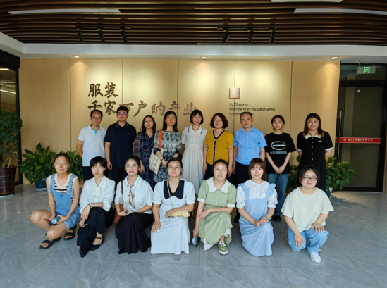 首先,由汇黎公司党总支书记刘经玉和总经理助理文雯带领师生全程参观了公司的展示大厅、设计和制衣车间、跨境直播间和外贸业务销售室,详细介绍了服装生产工艺和外贸销售环节。接着,学院师生还实地考察了公司的食堂、员工宿舍等生活区,全面了解了学生实习实践的后勤保障条件。