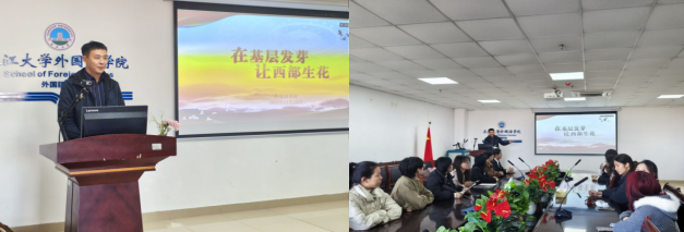 宣讲中,马老师详细介绍了西部计划的招募政策、服务领域及岗位需求,重点解读了外语专业学生在教育帮扶、文化交流等岗位的独特优势。他结合往届志愿者的服务案例,分享了志愿者在基层成长成才的故事,让在场学生真切感受“奉献、友爱、互助、进步”的志愿精神。