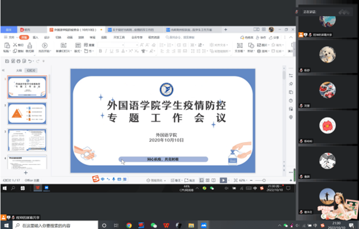 (通讯员:陈舒)为落实学校防疫工作要求,做好学院学生疫情防控工作,新葡的京集团35222vip于10月10日晚通过腾讯会议召开了学生疫情防控专题工作会议。全体院领导、辅导员、本科生班主任和研究生导师参加会议,会议由学院党委副书记程坤主持。