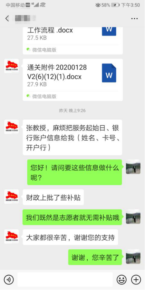 滞留在天门老家的张玉宏博士发挥专业特长,在省社科院的推荐下,参与了湖北省慈善总会海外捐赠物质清关及信息收集工作。工作结束后,慈善总会给张玉宏博士发放补贴被他婉言谢绝,他说:“我们既然是志愿者就不应该拿补贴,能为防疫工作做点力所能及的事,我也感到很光荣和自豪”。