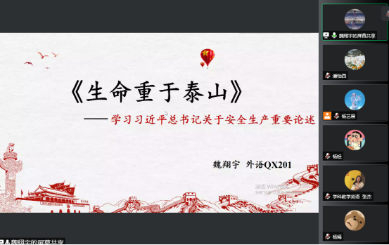 大会伊始,首先由21级外应陈舒同学介绍了“习近平:在庆祝中国共产主义青年团成立100周年大会上的讲话”,强调青春孕育无限希望,青年创造美好明天;21级英语笔译杨娃同学介绍了“习近平给南京大学留学归国青年学者的回信”,青年学者在信中表示,生逢伟大时代是人生之幸,留学归国青年要心系“国家事”、肩扛“国家责”;21级学科英语吴杰同学带领大家学习了“习近平在中共中央政治局第三十九次集体学习”,强调把中国文明历史研究引向深入推动增强历史自觉坚定文化自信20级外应魏翔宇同学讲解了《生命重于泰山——学习习近平总书记关于安全生产重要论述》专题片及解说词全文发布”,指出生命重于泰山,各级党委和政府务必把安全生产摆到重要位置,树牢安全发展理念;20级学科英语王荣同学带领大家学习了《湖北省学校安全条例》,其目的是为了加强学校安全管理,保障学生和教职工的合法权益;20级英语笔译白雪同学讲解了湖北省安全生产委员会关于贯彻落实国务院安全生产委员会《关于进一步强化安全生产责任落实 坚决防范遏制重特大事故的若干措施》的实施意见”这一专题,指出要深入学习贯彻习近平总书记关于安全生产重要论述和指示批示精神,确保学深悟透、落地见效。