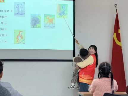 本次活动由新葡的京集团35222vip学科英语专业研究生丁金主讲、陈彩协助教学。活动围绕着经典绘本The Hug展开,通过播放妙趣横生的动画视频、讲解核心单词及发音技巧、深入解读绘本内容等多元化教学方式,引导学生学习了“rabbit”“mouse”“porcupine”“moose”等一系列与可爱动物相关的词汇。孩子们不仅掌握了多种动物的英文表达,也在故事中感受到友爱与团结的力量,领悟到“以创新方法化解矛盾、用包容心态接纳不同”的深刻内涵。活动现场还精心设计了“抽卡片介绍动物”“拼接词块成句”等互动游戏环节,让孩子们在轻松活泼的氛围中巩固基础单词与常用句型,有效提升了英语口语表达与即时反应能力,也将语言学习与日常生活更紧密地连结在一起。